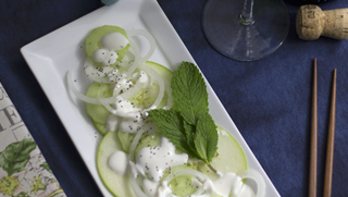With three discs of green apple at the bottom, tangy creme dressing and celery seed. It’s as crisp as the seam of your pants.
