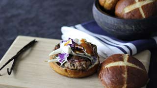 Meatballs topped with a vanilla-jicama slaw sit atop french rolls, drizzled lightly with plum sauce. Pairs well with patio parties in the springtime.