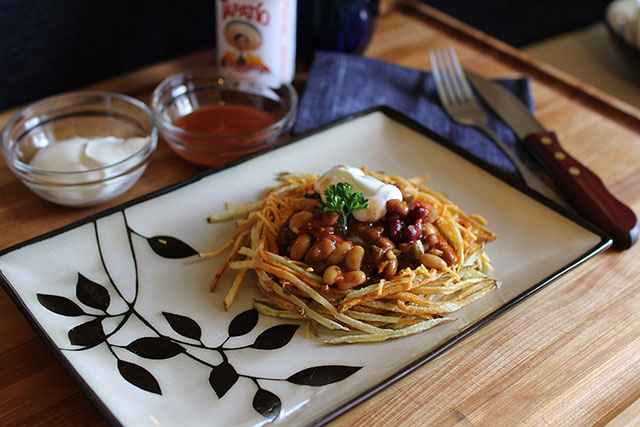 Put the potato strips into the large mixing bowl and cover with cold water and a small handful of salt. Let it soak for 20 minutes, stirring occasionally. Pat the potatoes dry with paper towels. Place in the refrigerator until you’re ready to get frying. Make the Chili before you start heating the oil!