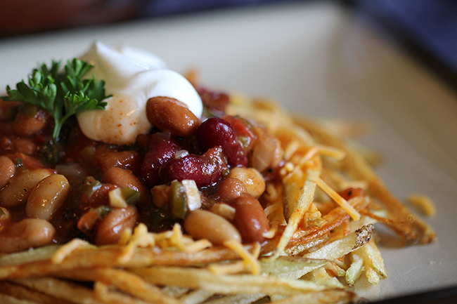Fashion the fries into a bird’s nest and line the bottom with a solid layer of cheddar. Add the chili and finish with a dollop of sour cream, more cheese, and a sprig of parsley.